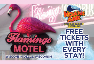 For decades, the Flamingo Motel & Suites has been welcoming visitors to Wisconsin Dells with budget-friendly rates, clean and comfortable rooms, and more recently, FREE full-day Noah’s Ark Waterpark tickets for each registered guest. Their sign on Wisconsin Dells Parkway...