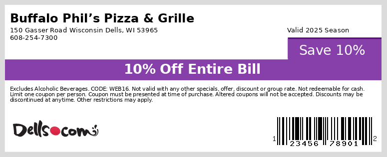 Buffalo Phil’s Pizza & Grille is locally owned and centrally located between Chicago & Minneapolis in the heart of Wisconsin Dells, Wisconsin. Buffalo Phil’s is under the same roof as Knuckleheads Trampoline Park * Rides * Bowling, and right next door to Booby Trap Escape Rooms & Outlets at the Dells (with over 75 shops). That’s a lot of fun at one convenient stop. Join us today!